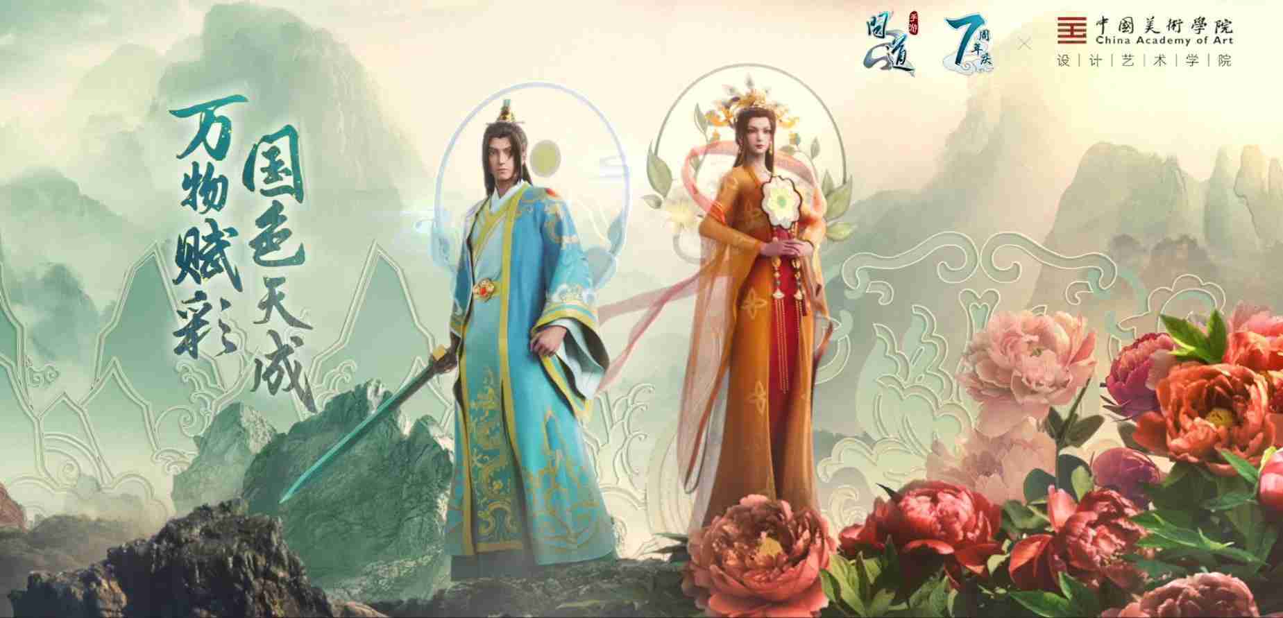 2023年4月,,,《問道手游》聯動中國美術學院,,,,在游戲中融合了中國歷史上不同時期的文化元素,,,打造了“山河萬象”與“鳳鳴九霄”的國風時裝。。在色彩配置方面,,創作團隊基于對游戲角色特性的分析提取相應的文化內涵,,,從每一種色彩的色相、、、指代事物和情感出發對應角色屬性,,,選定服裝的色彩搭配。。在紋樣設計方面,,,創作團隊結合游戲角色自身特殊的造型比例和形態,,,在實際的紋樣設計中進行了游戲語境下的活化演繹。。男性角色集中使用了如蟒紋、、、、海水江崖紋、、、如意紋和云氣紋等傳統紋樣元素,,女性角色則吸納了鳳凰紋、、、、牡丹紋、、、、卷草纏枝紋等元素,,,,組成以“雙鳳牡丹紋樣”“纏枝牡丹紋”“金玉鳳冠頭飾”為主要紋樣的游戲角色裝飾圖案系統。。